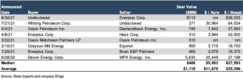 M&A transaction activity in the Bakken was steady through year-to-date 2021 and consisted of notable strategic acquisitions and exits in the basin.  Deal activity in the Bakken will be important to monitor as companies shift their focus to other basins and are forced to prioritize other initiatives.