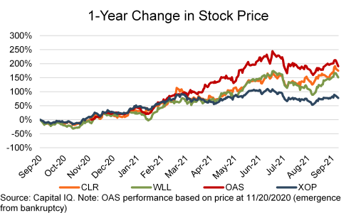 The Bakken public comp group saw strong stock price performance over the past year (through September 20th), with all constituents outperforming the broader E&P sector (as proxied by XOP). Continental and Whiting prices increased 175% and 151% year-over-year, compared to the XOP’s increase of 78%. Oasis, which emerged from bankruptcy in November 2020, is up 191% from its initial closing price post-bankruptcy. However, this impressive stock price performance is probably more reflective of the dire straits of these companies last year. Both Whiting and Oasis declared bankruptcy in 2020 and appear to have benefited from a cleaned-up capital structure.