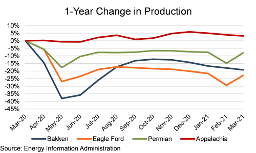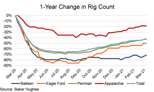 However, the Eagle Ford’s rig count has generally been rising over the past six months.  Total rigs in the Eagle Ford stood at 31 as of March 26, down over 50% from the prior year, but more than 3x higher than the low of 9 rigs observed in September 2020.  Bakken, Permian, and Appalachia rig counts were down 71%, 42%, and 19% year-over-year, though have all rebounded from the September lows (though not as dramatically as the Eagle Ford’s rise since then). While recent data has been noisy, and the Eagle Ford’s current rig count should keep production relatively flat, based on legacy production declines and new-well production per rig.