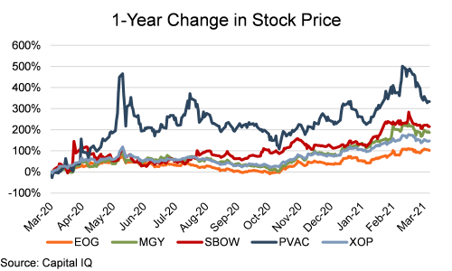 The Eagle Ford public comp group had a banner year for stock price performance over the past twelve months, with Penn Virginia, Silverbow, Mongolia, and EOG up 334%, 215%, 187%, and 102%, respectively.  All except EOG outperformed the broader E&P sector, as proxied by XOP (which was up 157% during the past twelve months).  However, that stock price performance is largely driven by the exceptionally low starting point in March 2020, as the Saudi/Russian price war and reduced demand due to COVID-19 lockdowns created significant concern among investors regarding the financial position of E&P companies, especially those with significant leverage.  Stock prices for the four companies remain below all-time highs.