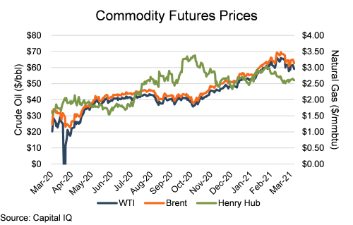 The first quarter of 2021 was relatively good for commodity prices, though they exhibited more volatility than in recent quarters.  Front-month WTI futures began the quarter at ~$48/bbl and increased to a peak of $66/bbl before ending the quarter at ~$59/bbl.  Henry Hub natural gas front-month futures prices broke above $3/mmbtu in February 2021, though regional spot prices were much more volatile as cold weather disrupted gas production and transmission while also increasing demand for heat and electricity.