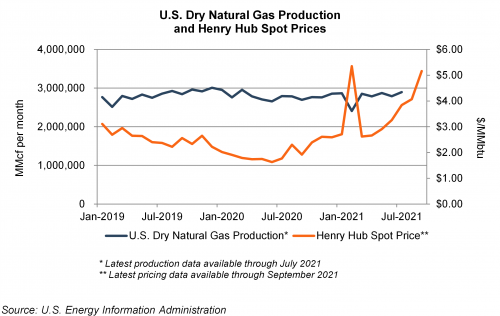 Per U.S. Energy Information Administration (EIA) data, 3Q2021 U.S. natural gas production neared its prior peak level, and EIA analysts expect that production will reach new record highs during 3Q2022. With such high production, basic economic theory would suggest that natural gas prices should be facing downward pressure. However, there’s the demand side of the equation to consider as well. Since the 2020 Covid-induced demand decline, the increase in natural gas demand has exceeded production recovery. Therefore, a supply versus demand imbalance has pushed prices up at an unusual rate.
