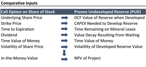 The PUD and unproved valuation model is typically seen as an adaptation of the Black Scholes option model. The Black Scholes option model is widely used to develop the value of European-style options. The adaptation is most accurate and useful when the owners of the PUDs have the opportunity, but not the requirement, to drill the PUD and unproven wells and the time periods are long, (i.e., five to ten years). The value of the PUDs thus includes both a DCF value, if applicable, plus the optionality of the upside, driven by potentially higher future commodity prices and other factors. The comparative inputs, viewed as a real option, are shown in the table below.