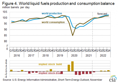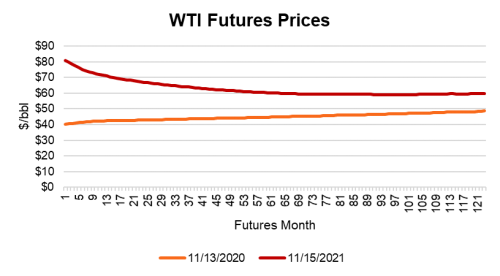 “We are encouraged by the restraint shown by U.S. upstream operators. By restricting capital expenditure, we are healing historic overproduction of both oil and natural gas. We believe investors will be attracted back into the E&P space if, as an industry, we continue on this path for at least a year or two more to deleverage balance sheets and return capital to investors.” -Fed SurveyRespondent It was a rough 2020, but producers have turned a corner on drilling discipline, and have restrained on the drill bit compared to years past. They also deleveraged balance sheets, and where possible, returned capital to shareholders. During 2021 traffic patterns have normalized, and apart from jet fuel, demand growth has bounced back to pre-pandemic levels. It is also creeping into winter and natural gas will be in season. That’s good news. Energy consumption is a bellwether for economic activity. However, that production discipline in both the U.S. and OPEC+ nations has resulted in crude oil inventories being 6% below the five-year average (2016-2020) overall. The Biden administration just announced a 50-million-barrel drawfrom the Strategic Petroleum Reserve. This imbalance started in Q3 2020 and has continued since, and is helping to keep prices high, though perhaps not for too long. The U.S. Energy Information Administration (EIA) projects this to come back into balance by Q2 2022.
