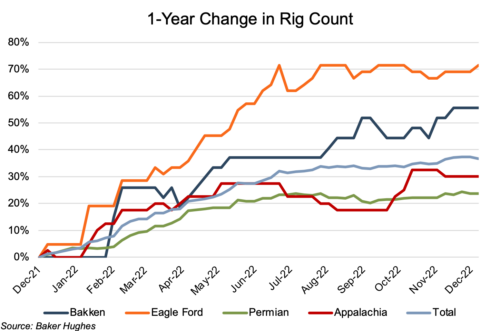 Rig counts continued to climb in all four basins over the last year. Growth rates in the Appalachian and Permian basins were more modest, while rates for the Bakken and Eagle Ford basins were notably higher. The Appalachian rig count rose 30% from 40 to 52 rigs. Among the oil-focused basins, the Eagle Ford led with a 71% increase from 42 to 72 rigs. The Bakken followed with a 56% increase (27 to 42 rigs), while the Permian had the lowest increase with a 24% increase (283 to 350 rigs).