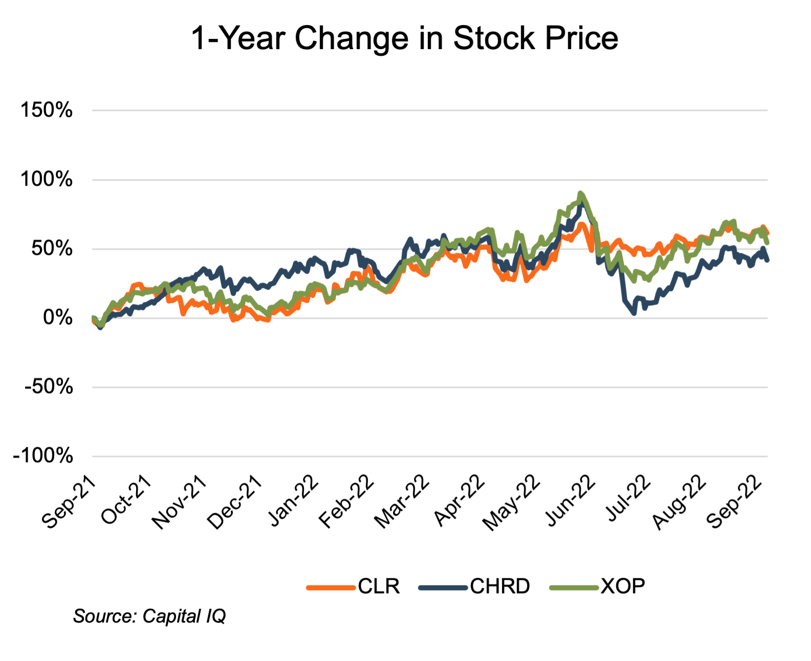 The Bakken comp group showed strong price performance from year-end 2021 through early June, with increases ranging from 63% to 83%, largely reflective of oil prices. The subsequent decline in commodity prices, which ran nearly un-checked for two months, slashed the analysis period performance to increases of only 3% and 46%, with Chord posting a decline that nearly wiped out its post September 2021 gains. Prices have recovered since July with one-year gains of 42% (Chord) to 61% (Continental).