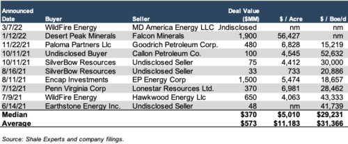 A table detailing E&P transaction activity in the Eagle Ford over the last twelve months is shown below. The median deal value in the past four quarters ($370 million) was approximately $282 million higher than the median deal value from Q2 2020 to Q1 2021, excluding Chevron’s acquisition of Noble Energy in July 2020. The average deal value over the past year ($573 million) was more than double the average value ($274 million) over the prior year (excluding the Chevron-Noble Energy deal). Also notable, larger positions were transacted over the past year, with a median size of 45,000 net acres as compared to 26,500 net acres in the prior year (excluding Chevron-Noble Energy), and an average deal acreage of nearly 80,000 net acres this past year which was more than double the average of 34,775 net acres in the prior year.
