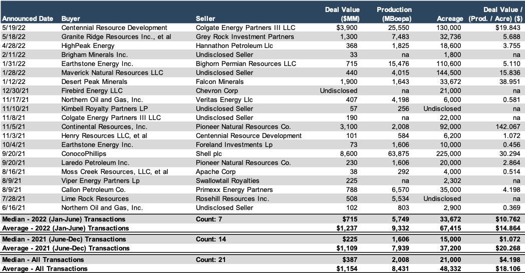 The approach to the marginal "equilibrium" appears to have been a pretty short runway to land on. Of the 21 transactions completed, 14 occurred from June to December, with the remaining 7 occurring from January 2022 to the present. One metric we analyzed, based on the deal value per production (annualized) per acre, indicates a sharp decline in the "bang for the buck" exhibited by the transactions before and after year-end 2021. As presented below, the median cost per production acre for the 14 transactions from June to December 2021 was $1.072. In contrast, the median metric for the seven transactions from January to June 2022 was $10.762, indicating a 10.0x increase in the cost per production acre.