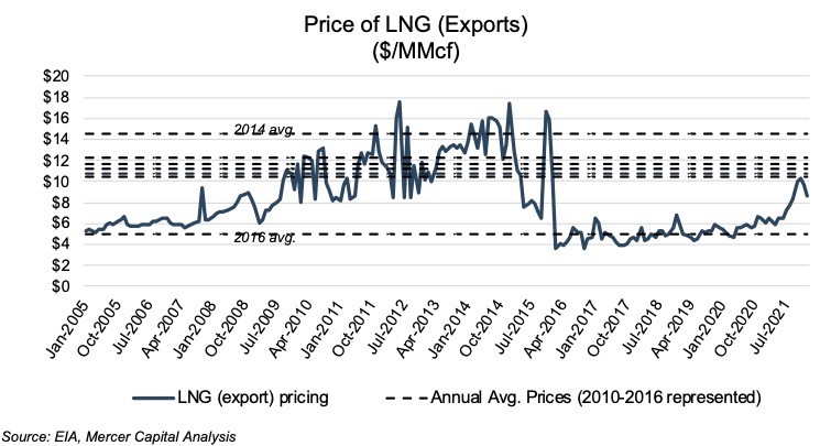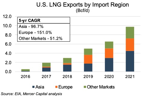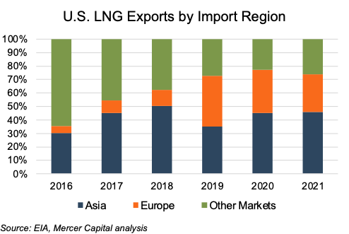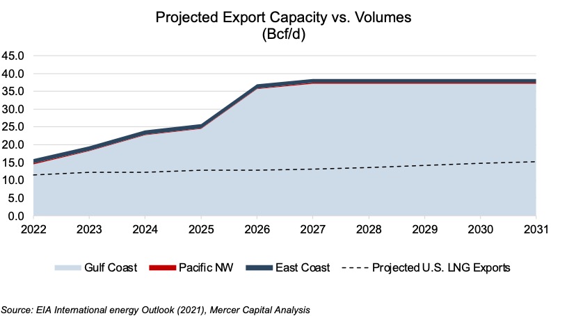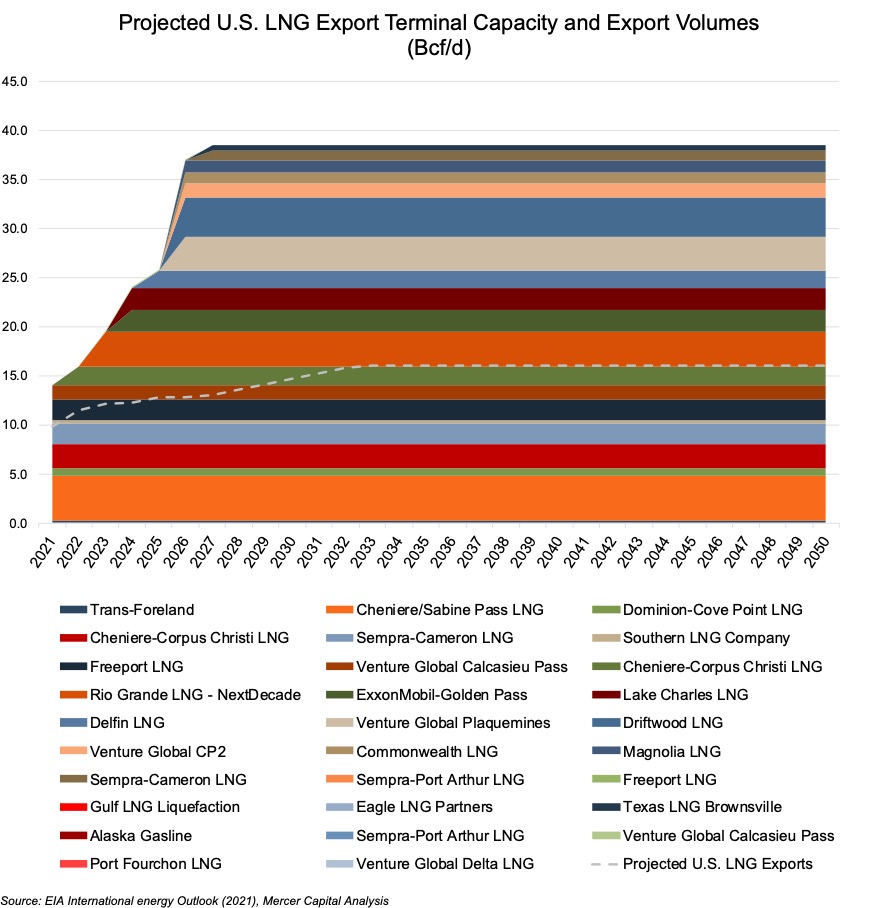 Further detail regarding the export terminal facility and capacity expansion projects are provided in Appendices A and B. Based on the eye-ball test, it’s pretty clear that projected export capacity could far outstrip demand for U.S. LNG, based on the EIA’s export projections (as of early 2021), only if all that capacity were to come online.  Free Market Economics 101 theory would indicate, rather decisively, that such excessive capacity would clearly not be worth building out given the export volumes projected as of early 2021.  Then, on February 24, 2022, Russia – the largest supplier of LNG to Europe – invaded Ukraine. In Part 2 of our analysis on U.S. LNG Exports, we will take a closer look at the destination markets of U.S. LNG export cargoes, with a particular focus on Europe and its move away from Russian natural gas, and the commitment by the U.S. to help mitigate that transition while balancing its policies and goals aimed at addressing climate change. We have assisted many clients with various valuation needs in the upstream oil and gas space for both conventional and unconventional plays in North America, and around the world.  Contact a Mercer Capital professional to discuss your needs in confidence and learn more about how we can help you succeed.