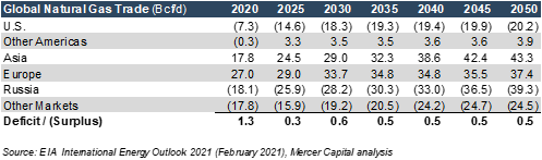 On a forward looking basis, projections of global natural trade by the EIA in its International Energy Outlook 2021 report indicate a natural gas deficit may be the norm over the next 30 years.  (Negative values represent net exporters, with positive values representing net importers.)