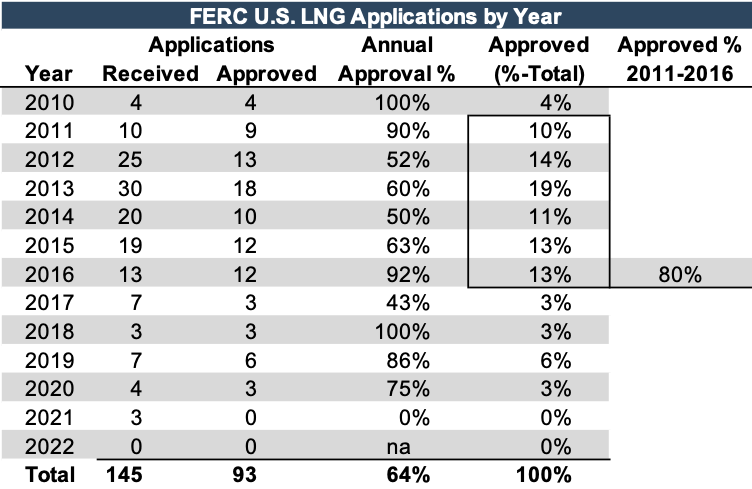 From 2010 to 2021, the Federal Energy Regulatory Commission (“FERC”) received approximately145 long-term applications for export facilities seeking to export liquified natural gas to countries both with and without free-trade agreements (“FTA”) with the U.S.  Of these 145 applications, 93 (or 64%) have been approved, with approximately 80% of the approved applications coming from submissions made from 2011 through 2016.Up to this point, we have seen applications either submitted or reasonably anticipated to be submitted for approximately 25 export facilities.