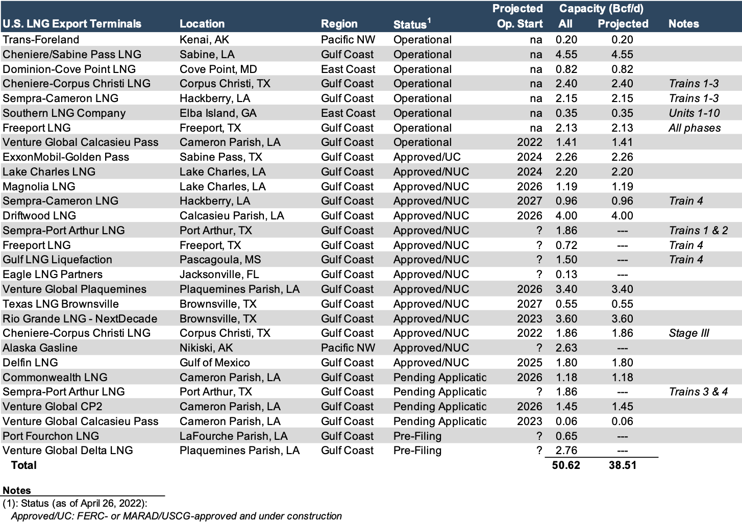 Part I: The Current State of U.S. LNG Export Terminal Facilities and Projected Export Capacity