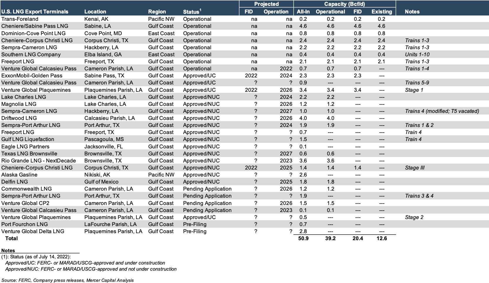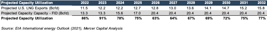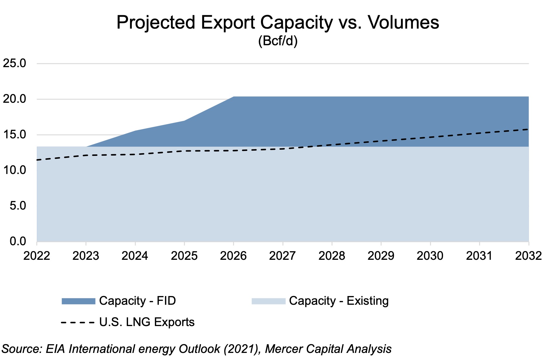 When stratifying the export capacities of all facilities for which an in-operation date has been put forth, all facilities for which an affirmative FID has been made, and all facilities which are currently in operation, it becomes clear that the capacity of the last group represents the boundary by which the projected LNG export levels anticipated by the EIA over the next 5 years are limited.