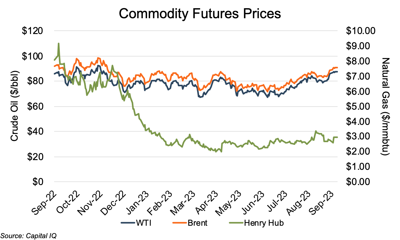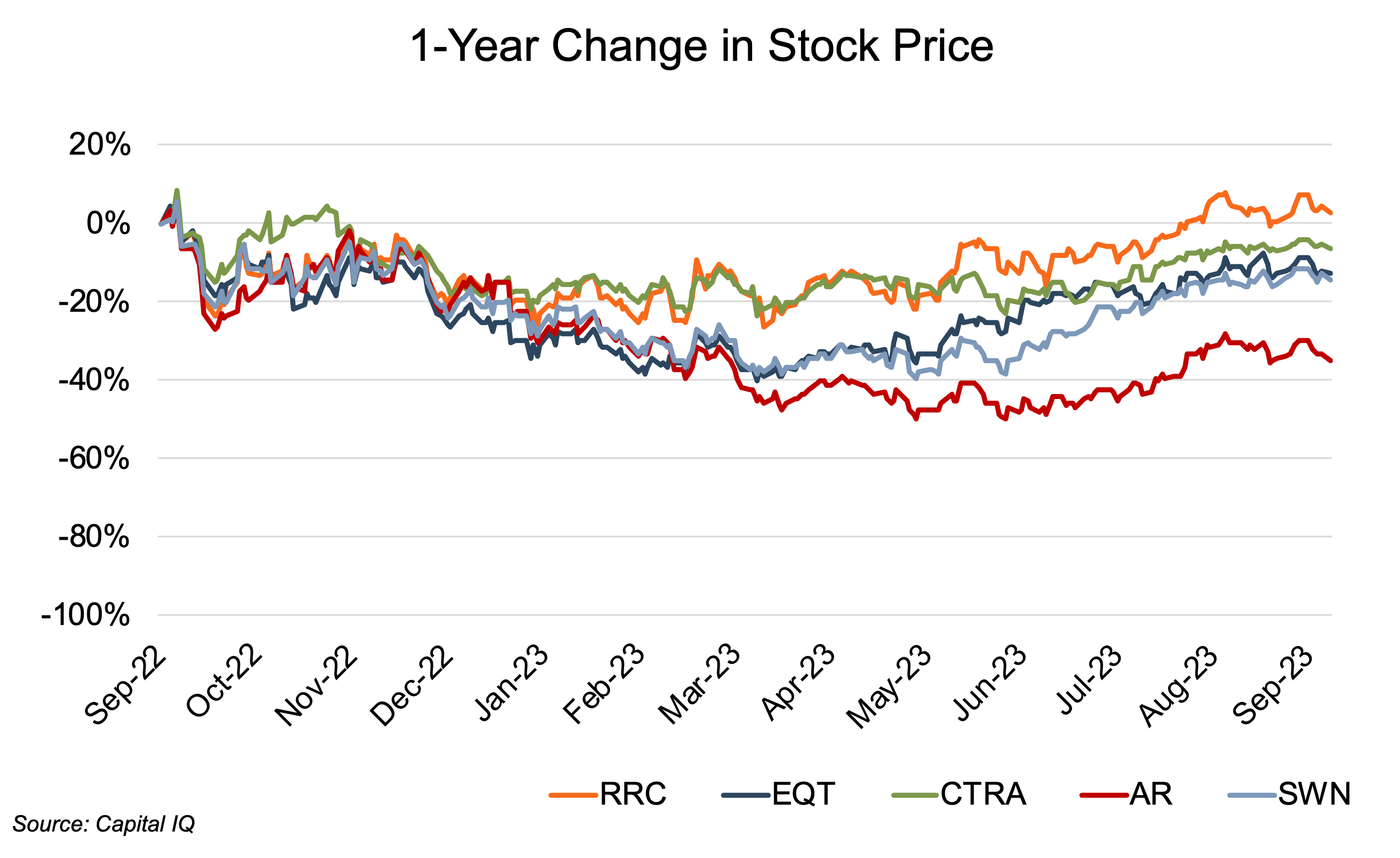 The Appalachian public comp group saw markedly weak stock price performance over the past year (through September 11, 2023), with only Range Resources ending the 12-month period above its September 2022 starting price. The remaining comp group members (EQT, Coterra, Antero, and Southwestern) all posted twelve-month declines ranging from 7% for Coterra to 35% for Antero. The comp group stock prices generally followed the trend in oil prices, although the early period decline only held through March, after which a general recovery ran through the end of the review period in September. Through mid-March, the average comp group decline had reached 34%. However, the subsequent recovery in oil prices led to an average comp group price increase of nearly 32% through early September.