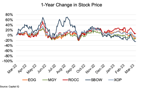 Strong rig-count growth spurred an Eagle Ford production increase that was second only to the Permian. However, production improvement was offset by commodity price easing in the latter half of 2022 and early 2023, resulting in Eagle Ford comp group stock price declines over the last year. Despite those dynamics, interest in the Eagle Ford remains high, with Devon doubling its presence in the basin in late 2022 and SilverBow making significant acquisitions (SandPoint and Sundance) last year.