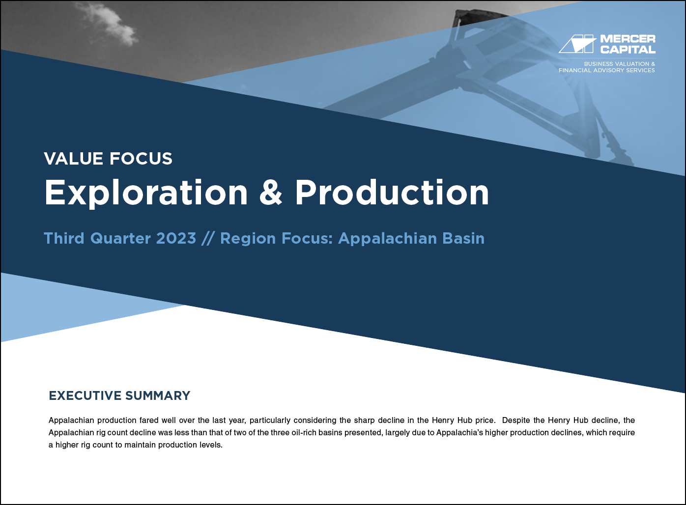 Mercer Capital’s Value Focus: Exploration & Production newsletter provides an overview of the industry through supply and demand analysis, commodity pricing, and public market performance. In addition, each issue of this quarterly newsletter focuses on a region, including Eagle Ford, Permian, Bakken, and Appalachia, examining general economic and industry trends. Appalachian production fared well over the last year, particularly considering the sharp decline in the Henry Hub price. Despite the Henry Hub decline, the Appalachian rig count decline was less than that of two of the three oil-rich basins presented, largely due to Appalachia’s higher production declines, which require a higher rig count to maintain production levels.