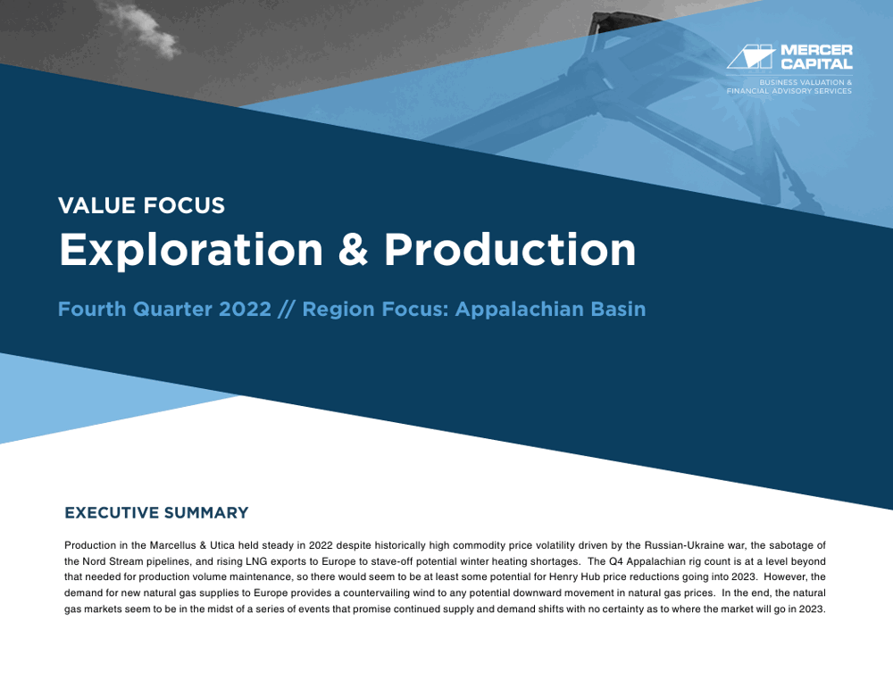 Mercer Capital’s Value Focus: Exploration & Production newsletter provides an overview of the industry through supply and demand analysis, commodity pricing, and public market performance. In addition, each issue of this quarterly newsletter focuses on a region, including, Eagle Ford, Permian, Bakken, and Appalachia, examining general economic and industry trends. In this quarter’s newsletter, we focus on the Appalachian. Notable topics include Russia-Ukraine War’s effect on the demand for LNG exports to Europe in the face of winter, tight valuations between major operators, flat production levels in the region despite a high commodity price environment, as well as increased M&A activity in 2022 highlighted by Sitio Royalties and Brigham Minerals merger — creating the largest public minerals owner.