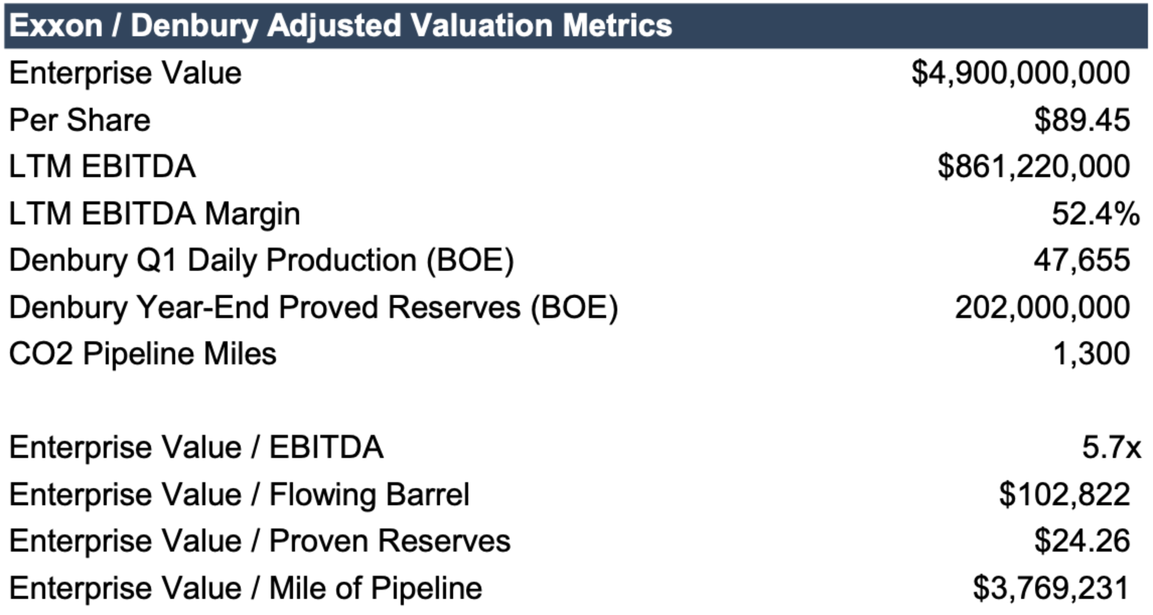 Denbury is primarily a regional oil producer with less than 50 thousand barrels per day of production and EBITDA margins lower than many public oil companies. To its credit, Denbury does have lower decline rates than other companies due to the maturity of the fields they produce from. However, the flip side is that it costs $35-$39 per barrel to produce. Those are expensive lease operating costs when many companies operate somewhere in the teens per barrel. All that said, Enverus’s estimate in their Hart Energy interview was that the EOR business contributed about 38% of Denbury’s value. So, if Enverus’s analysis is to be applied here, that would put an adjusted value on Denbury’s production at around $39,000 per barrel and an adjusted value per pipeline mile of around $2.3 million. Take a look at these “adjusted” figures: