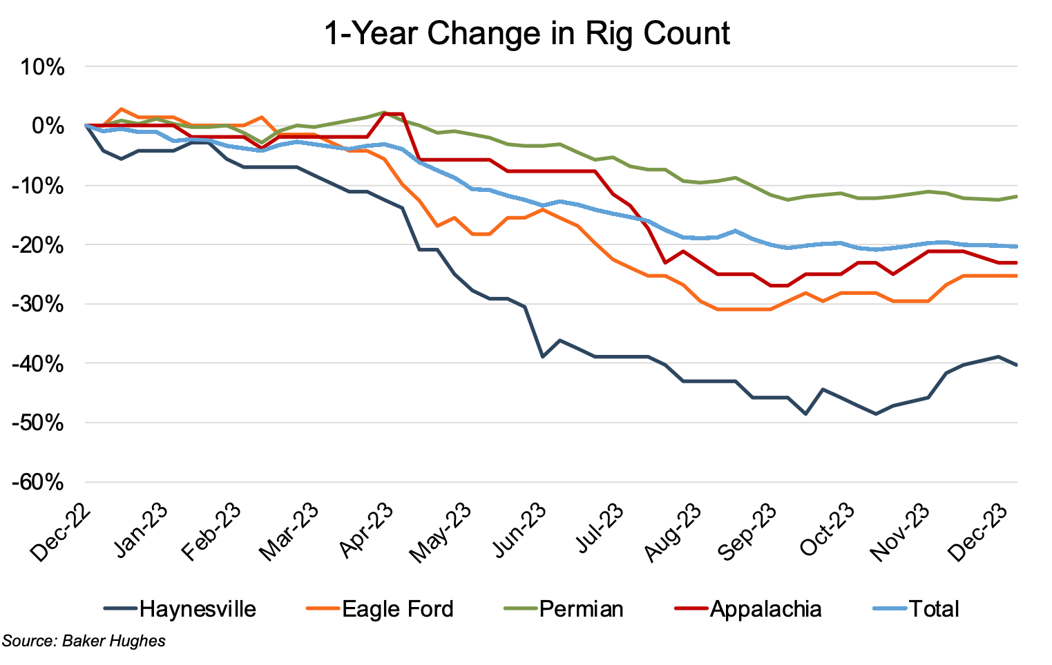 Estimated Haynesville production (on a barrels of oil equivalent, or “boe” basis) rose by 1.3% year-over-year through November — marking it as the basin with the smallest increase among those included in our analysis. While Haynesville production growth over December 2022 levels generally crept upward through April (reaching a high of 5.8% through April), the trajectory turned downward with only a single uptick month during the remainder of the year. Production growth in the remaining basins (the Eagle Ford, Permian, and Appalachian) was more robust, with the Eagle Ford posting the 2023 growth high mark at 9.7% in April. Year-over-year growth for those basins showed increases of 5.5%, 8.5%, and 3.6%, respectively. The slower expansion of the Haynesville can be attributed to its significant decline in rig count throughout 2023, surpassing the declines observed in the other three basins.