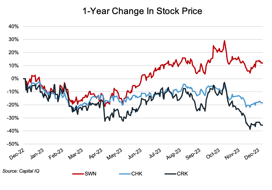 The Haynesville public comp group showed materially divergent stock price performance throughout the year, with Southwestern leading the group with a price increase of 12%. Chesapeake followed with an 18% decline, leaving Comstock with a 35% price plunge. Hedging strategies seem to explain a portion of the price performance differential in that Southwestern maintained a significant hedge book to protect cash flows, while Comstock had limited hedge coverage. All three companies showed equity value declines coinciding with Henry Hub pricing declines over the year, but highly-hedged Southwestern’s stock price showed a much smaller reaction to the commodity price dips than did the modestly-hedged Comstock.