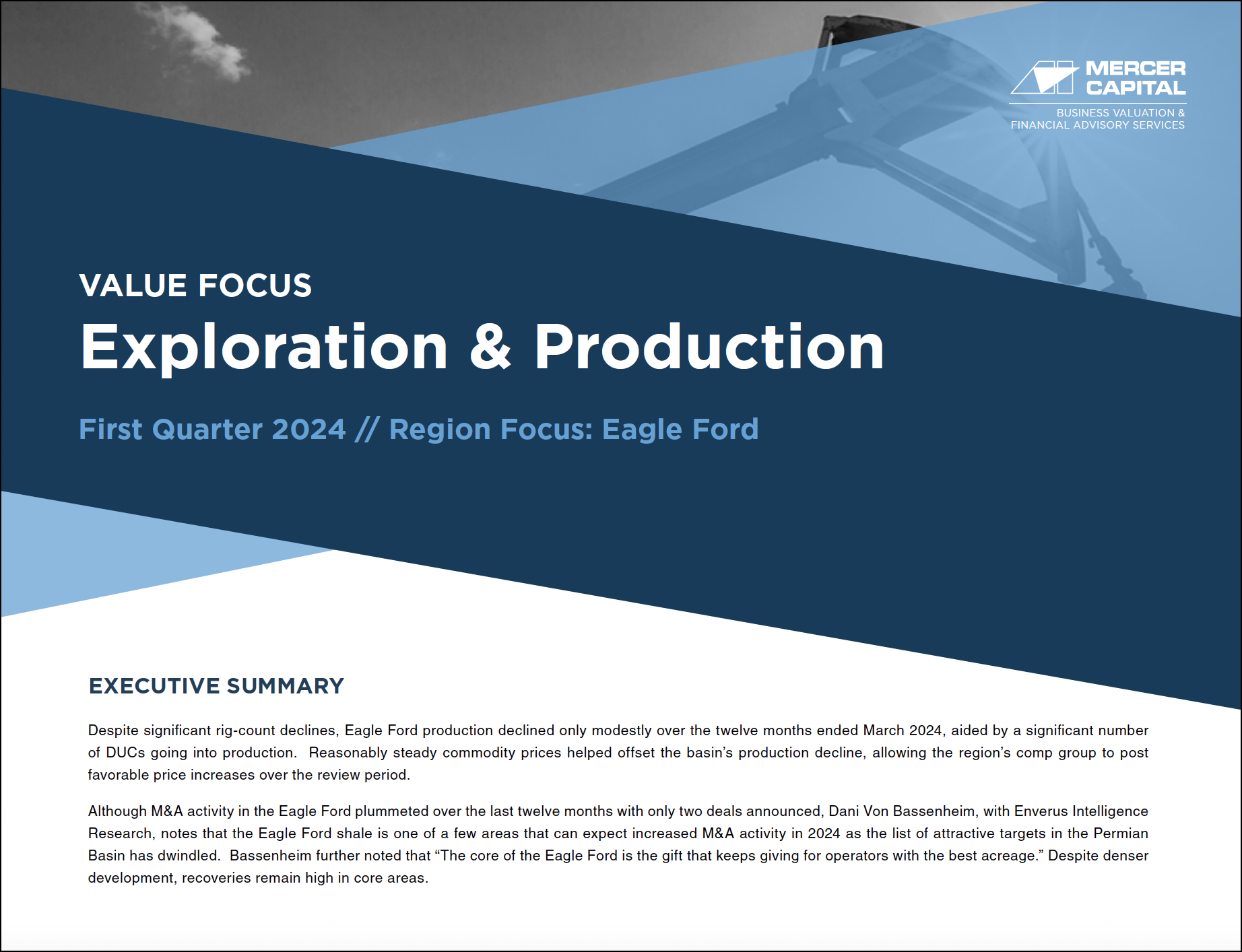 Mercer Capital’s Value Focus: Exploration & Production newsletter provides an overview of the industry through supply and demand analysis, commodity pricing, and public market performance. In addition, each issue of this quarterly newsletter focuses on a region, including Eagle Ford, Permian, Appalachia, and Haynesville, examining general economic and industry trends.
