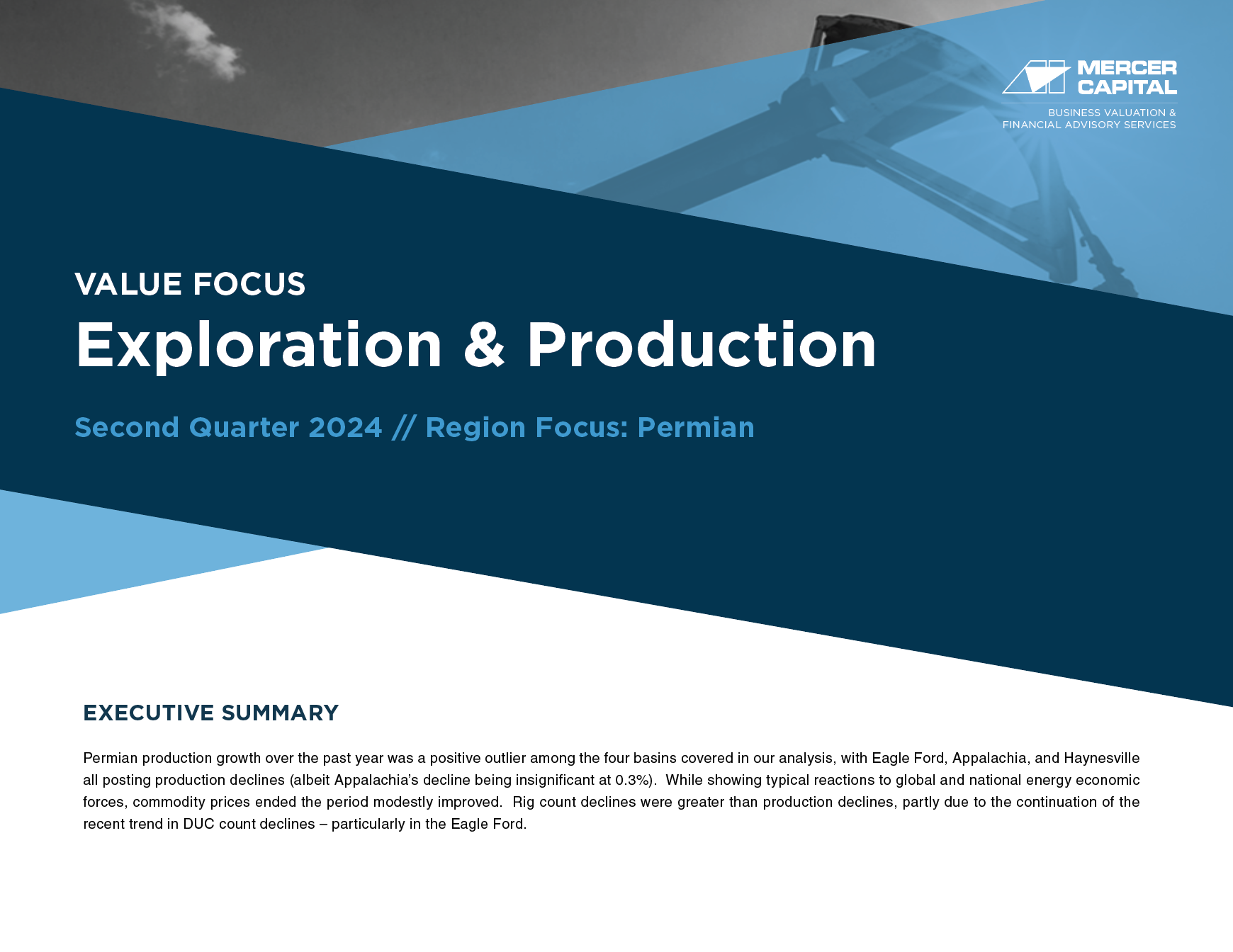 Mercer Capital’s Value Focus: Exploration & Production newsletter provides an overview of the industry through supply and demand analysis, commodity pricing, and public market performance. In addition, each issue of this quarterly newsletter focuses on a region, including Eagle Ford, Permian, Appalachia, and Haynesville, examining general economic and industry trends. In this quarter's issue, we focus on the Permian. Permian production growth over the past year was a positive outlier among the four basins covered in our analysis, with Eagle Ford, Appalachia, and Haynesville all posting production declines (albeit Appalachia’s decline being insignificant at 0.3%). While showing typical reactions to global and national energy economic forces, commodity prices ended the period modestly improved. Rig count declines were greater than production declines, partly due to the continuation of the recent trend in DUC count declines – particularly in the Eagle Ford. Read more about the Permian and other industry analyses in this quarter's issue.