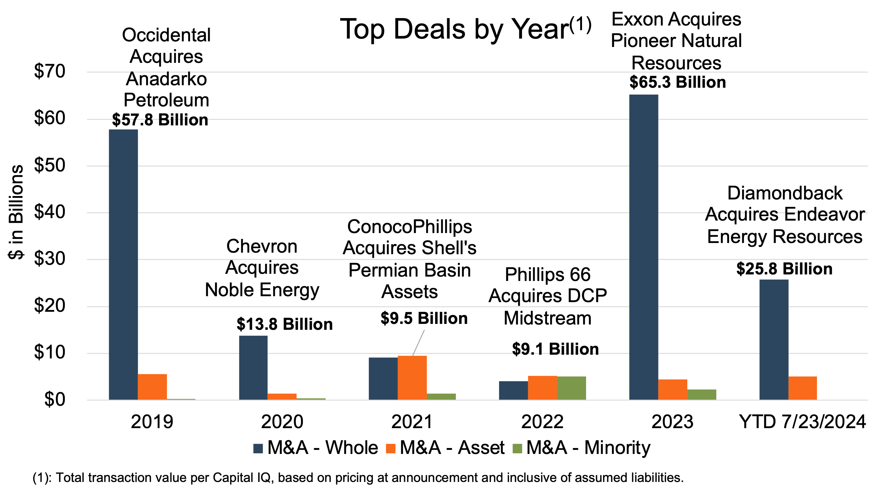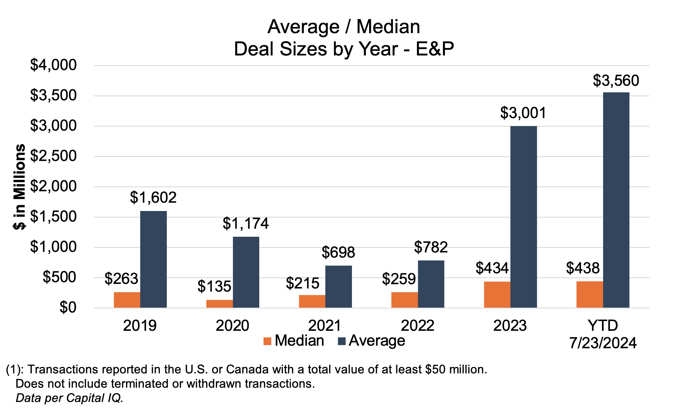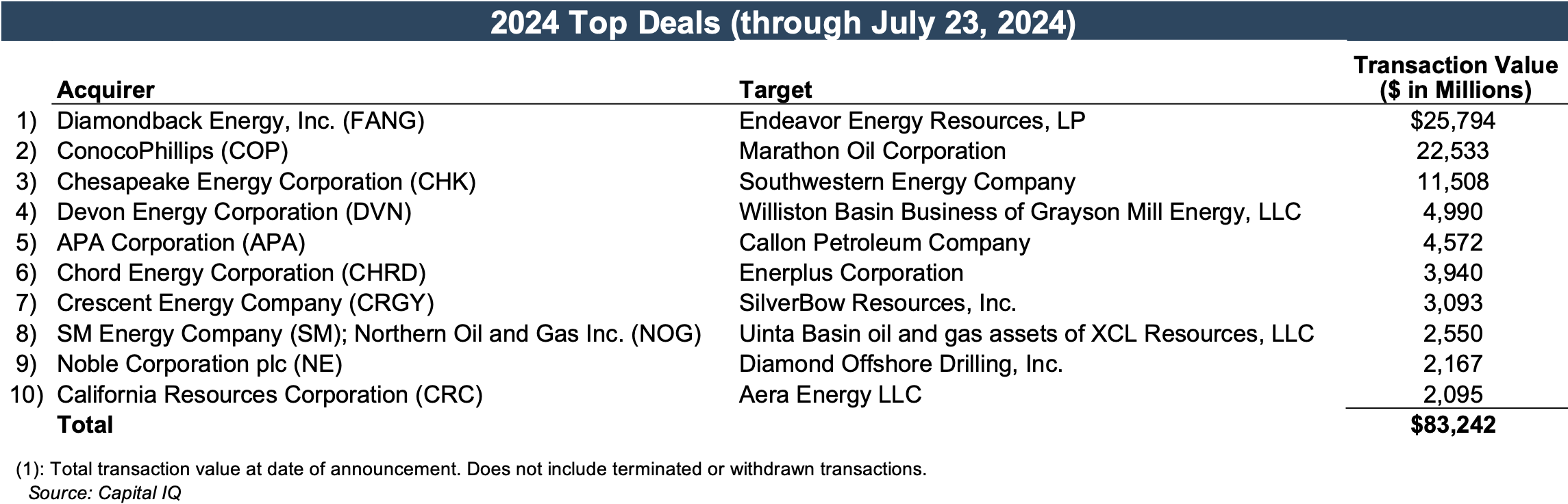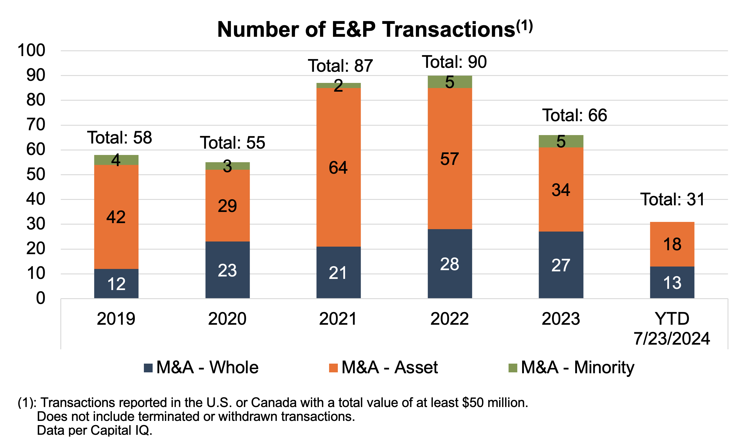 Large producers have continued to be targeted in 2024, including Diamondback Energy acquiring Endeavor Energy Resources for $26 billion, and ConocoPhillips acquiring Marathon Oil for $23 billion. For context, apart from the Pioneer and Hess acquisitions in 2023, the acquisitions of Endeavor and Marathon were both larger than any other E&P deal since 2019. Of the 31 transactions announced through mid-July of this year (at least $50 million), the top ten deals comprised over 90% of the total based on announcement pricing.