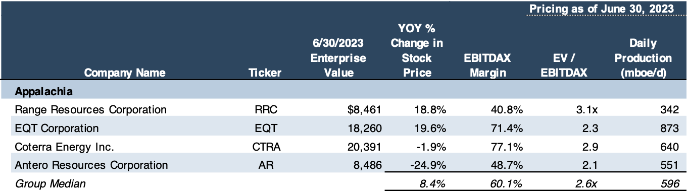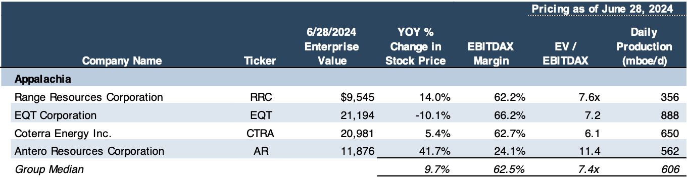 One of the indicators of this buoyed optimism for Appalachian upstream producers are the cash flow or EBITDA multiples that they are trading at. As a group, they were averaging above a seven (7x) multiple. In the past several years, they have more often traded closer to three (3x) times. Take for example, Mercer Capital’s second quarter data this year versus 2023.