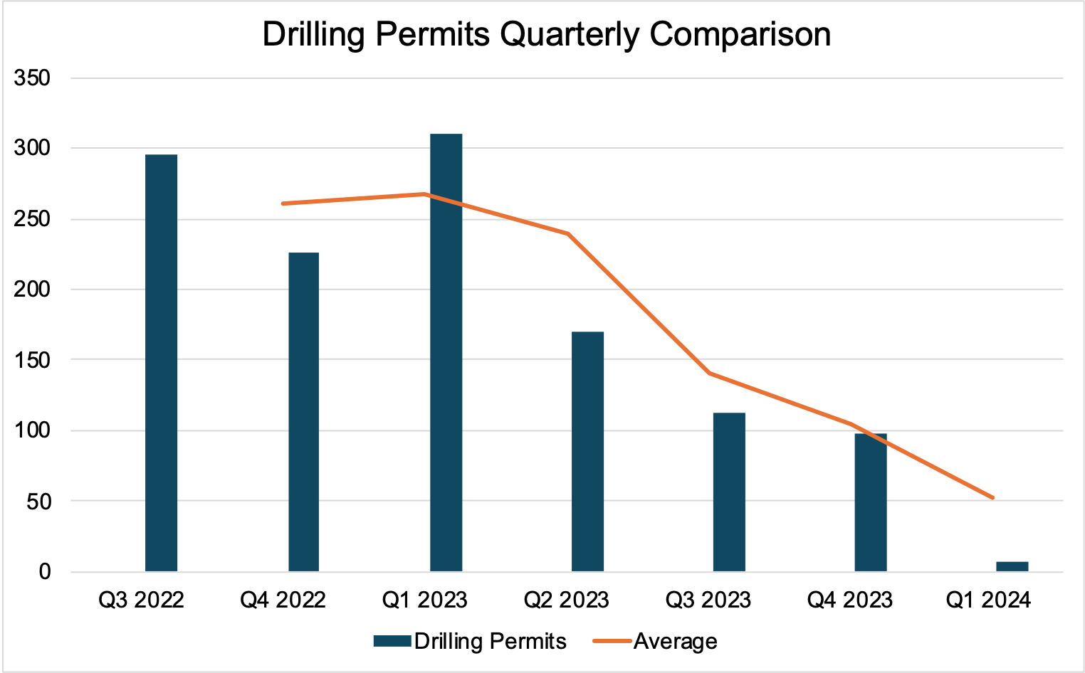 While production levels have shown relative consistency over time, the number of drilling permits issued has seen a marked decline quarter-over-quarter. Excluding the first quarter of 2023, there’s been a steady reduction from Q3 2022 through Q1 2024, averaging a 29% drop. The stark contrast between the mere seven permits issued in Q1 2024 and the 310 permits in Q1 2023 casts a concerning shadow over future projections.