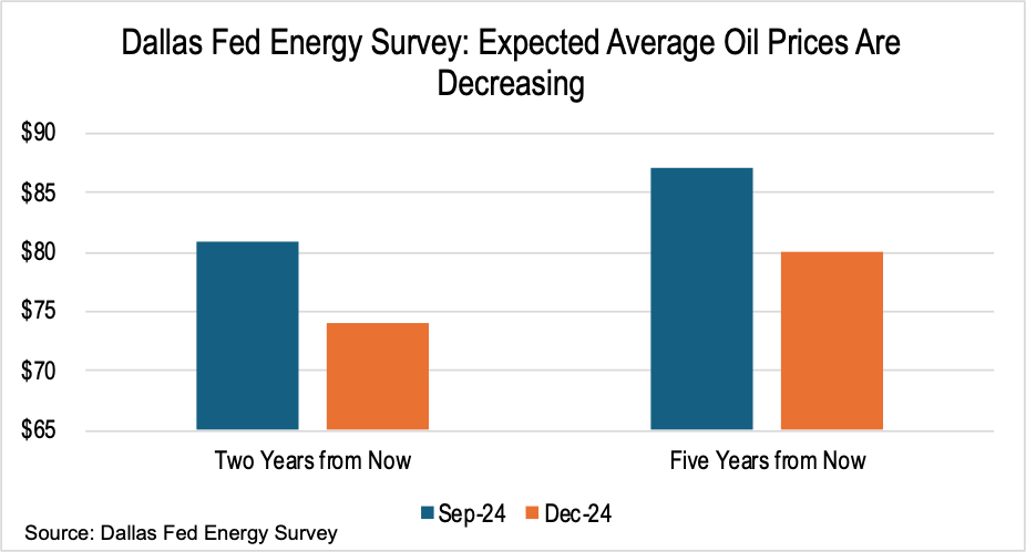 That sentiment is continuing into longer term estimates as well. The NYMEX curve was in contango as of the time of this article, meaning that futures prices are lower than current prices. The December 2028 contract was below $64. The Dallas Fed Survey respondents were more optimistic about overall prices but displayed a similar declining trend in their estimates. More respondents estimated lower prices on average than higher prices. Two-year price estimates fell from $81 as of September 2024, to $74 as of December 2024. Same for longer term estimates as well.