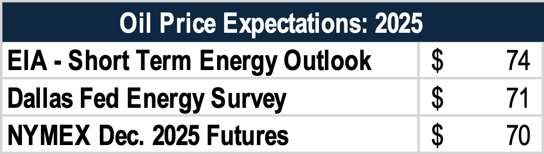 All these factors, and I’m sure more that I haven’t covered here, have led to a softer oil price market for 2025. EIA, Dallas Fed Survey, and NYMEX futures all currently estimate prices to be in the low 70’s for this year. Estimates can vary of course, and oil prices are so sensitive to geopolitical events that these estimates could be out the window in short order. However, the supply surplus and tempered global demand have put the market in a relatively weak pricing position.