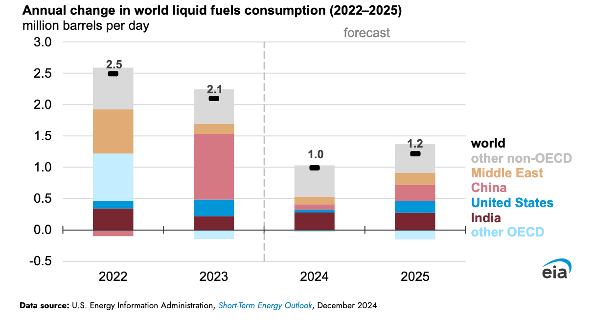 Demand around the world is growing for oil. EIA estimates consumption to be up by 1.2 million barrels per day. However, the pace for growth has slowed, particularly in China. Demand growth was hacked nearly in half in 2024 compared to 2023. China is importing 300,000 barrels a day less than at the end of 2023. Deflationary pressures and banking issues continue to reduce demand. It has also given way to India as the leading global source of oil demand.