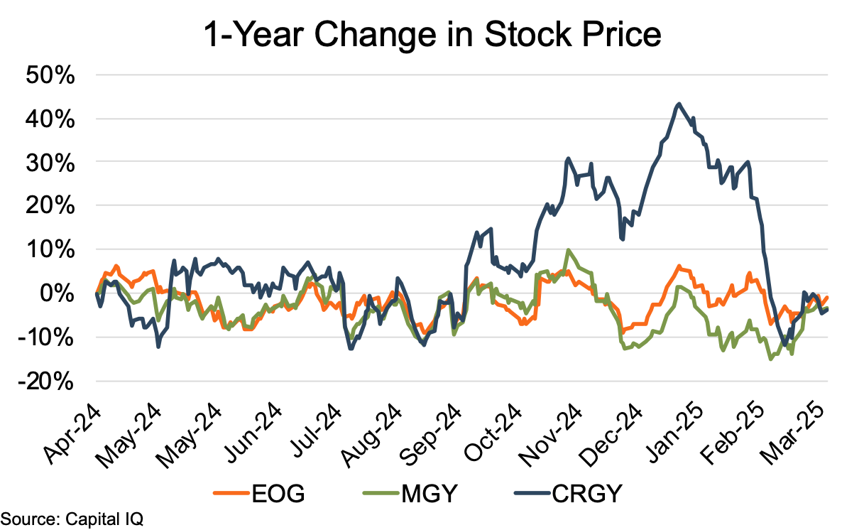 Stock prices among the public comparable group for Eagle Ford showed YoY declines within a narrow range of 1% to 4%. However, the “path” to those similar YoY declines was markedly different for EOG Resources (EOG) and Magnolia Oil & Gas (MGY) versus Crescent Energy (CRGY). EOG and MGY posted similar patterns of rises and falls during the review period, generally varying between year-to-date (YTD) increases and declines between +10% and -10%. Only MGY broke outside of that +10% to -10% range during the last four months of the period. Even the range breakout only took MGY’s YTD price change down to lows of -13% in mid-December and early February and to a review period low of -15% in early March.