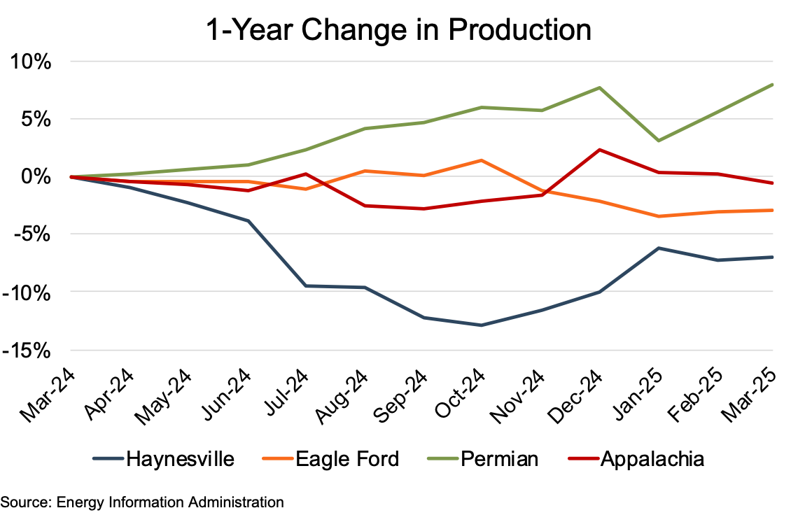 All four regions suffered rig count declines over the year ending March 2025. Haynesville and Appalachia tied for the largest percentage decline at 17%, with Eagle Ford posting a slightly lower 13% decline. Even the stalwart Permian ended the period with a YoY decline, though the most modest for the four regions, at 6%. The returning culprit was reduced commodity prices, leading to the rig count reductions.