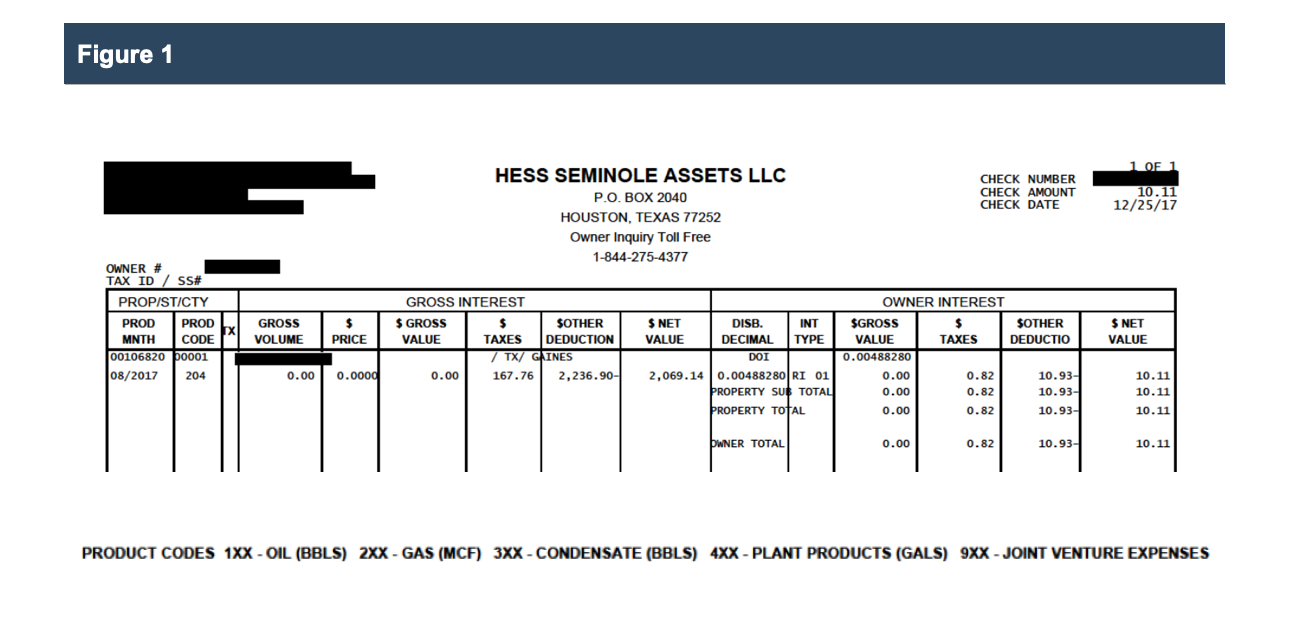The revenue received by both the operator and ultimately the owner depends on both the quantity produced and the price achieved. As of the date this article is re-posted, crude oil is trading around $66 per barrel for West Texas Intermediate (WTI), the most commonly tracked figure for U.S. crude oil. By comparison, natural gas prices settled at $4.45 per MCF, the most common benchmark for natural gas in the country. Knowing what is being produced: oil, gas, NGL, or a combination of these is crucial to understanding the value of the interests. Owners can figure this out by looking at the product code on their checks, which can be expressed as either a letter or number. Our first example lists the product code as 204, and the legend at the bottom of the check indicates that gas is being produced. Even less clearly, our second example shows the letter “G” under the “P” column, and which, according to the legend, means gas is being produced. This can be far from intuitive without some sort of key describing each item.