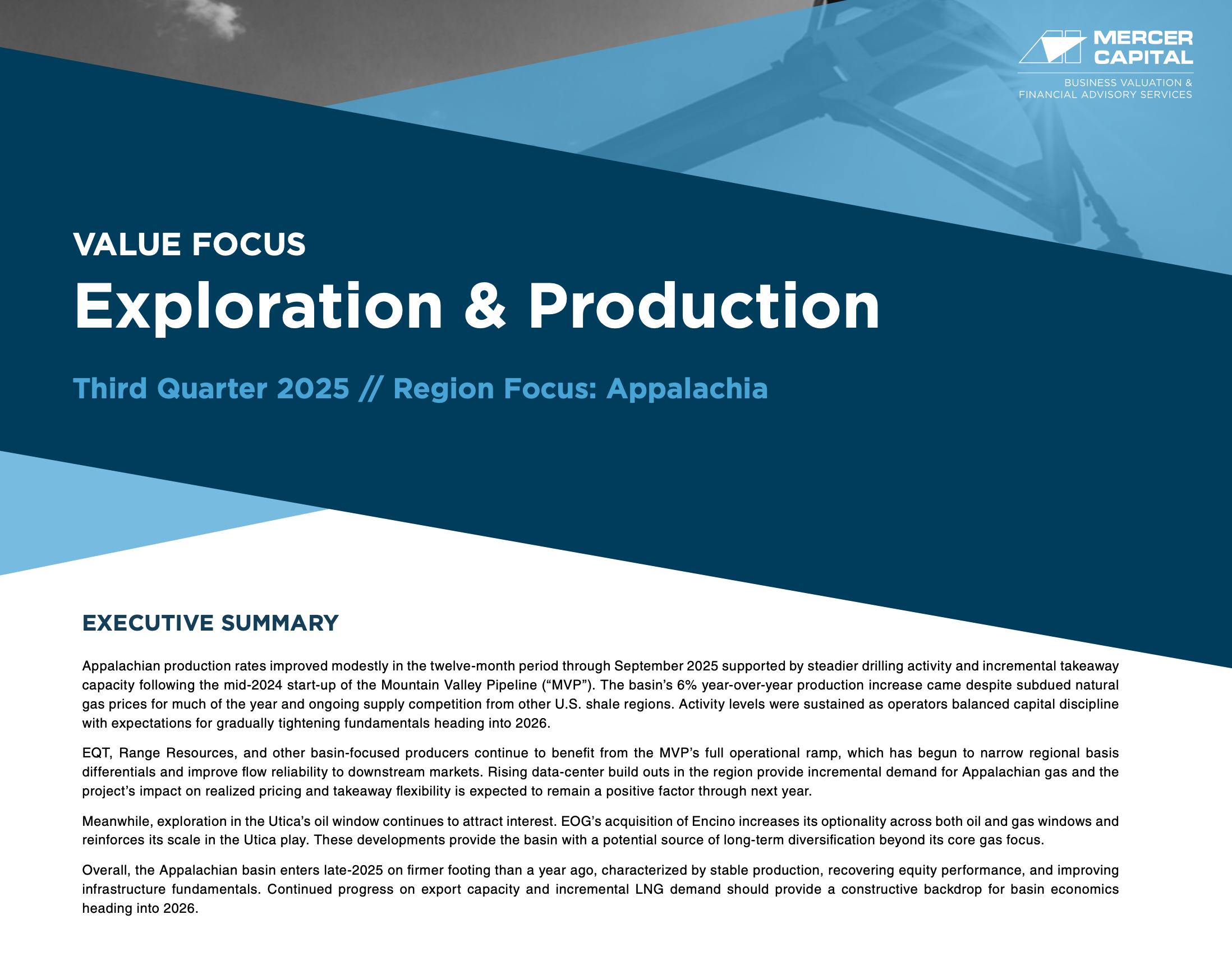 Mercer Capital’s Value Focus: Exploration & Production newsletter provides an overview of the industry through supply and demand analysis, commodity pricing, and public market performance.