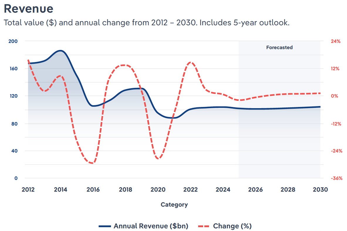 After 10 years of lagging behind the overall O&G industry growth, with revenues tumbling from a 2014 high of $186 billion to the 2021 low-point at $88 billion, the OFS industry posted three consecutive years of revenue expansion through 2024.