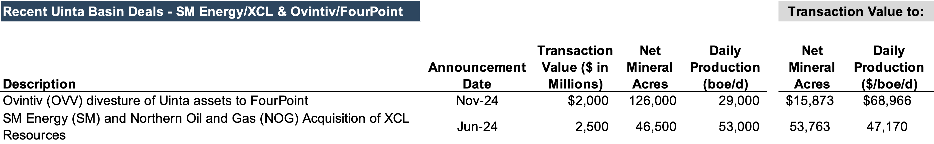 Public E&P companies with a current presence in the Uinta basin include SM Energy (NYSE: SM), Crescent Energy Company (NYSE: CRGY), and Berry Corporation (NASDAQ: BRY). Just a few weeks ago, Ovintiv (NYSE: OVV) completed the $2 billion all-cash sale of all of its Uinta assets to FourPoint Energy, a private equity-backed oil and gas company. The transaction was first announced in November 2024, and the divesture by Ovintiv included 126,000 net acres and an average oil production of 29,000 bbls/d.