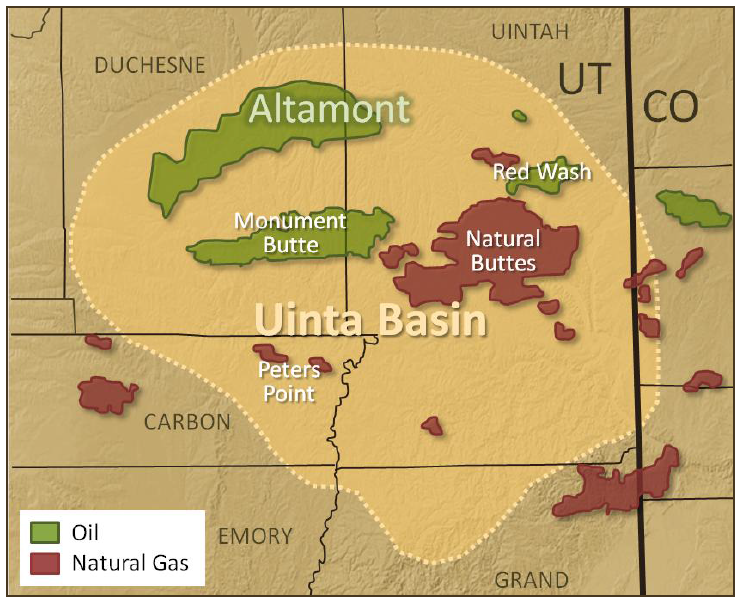 The Uinta Basin is a geological formation located in northeastern Utah that extends into Western Colorado on its easternmost front where it is bound by the Piceance Basin. The Uinta Basin is rich in oil and gas reserves and is a stacked formation with pay zones ranging from around 1,300' to 18,000' in depth. It is also home to the Uintah and Ouray Indian Reservation, one of the largest Native American reservations in the U.S. Major oil discoveries led to the basin's first significant development in the 1940s. Average crude oil production dropped by more than half from 1985 (44 mbbl/d) to 2002 (20 mbbl/d), but with the rise of hydraulic fracturing (fracking) and horizontal drilling, the basin's relevance has resurged, making it a hotspot for tight oil development and a significant contributor to U.S. oil and gas production. The basin is currently thought to produce around 160 mbbl/d.