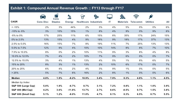 To gain a little more perspective on revenue growth for our benchmark universe of public companies, we pulled revenue figures for the five years ending with 2017. Comparing the 2017 revenue figures to 2013 revenues, we calculated the compound annual growth rate (or CAGR) for each company. For multi-year periods, the compound annual growth rate smooths out year-to-year variations and represents the overall annualized growth rate for the period.