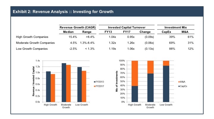 Corporate investment may take the form of either capital expenditures or merger & acquisition activity. Exhibit 2 also summarizes the relative mix of investment for the subgroups of companies. The data suggests that the high growth companies rely more heavily on M&A, while the low growth companies tend to focus more on capital expenditures. If we assume that capital expenditures are a (very imperfect) proxy for organic growth, this data confirms that the fastest growing firms are augmenting organic growth opportunities with strategic acquisitions.