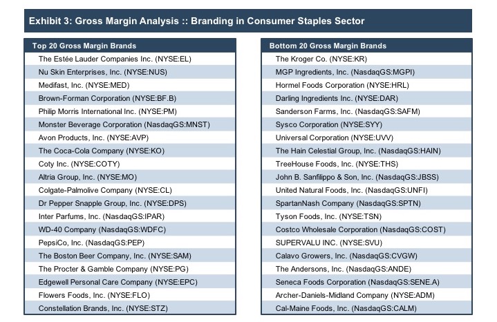 The role of brands in customer behavior is critical in the consumer staples sector. These companies sell basic consumer goods (food, cleaning supplies, personal care products, etc.) and rely heavily on marketing and branding to drive sales. We sorted the consumer staples companies in our sample by gross margin, listing the twenty companies with the highest gross margins and the twenty companies with the lowest gross margins on Exhibit 3.