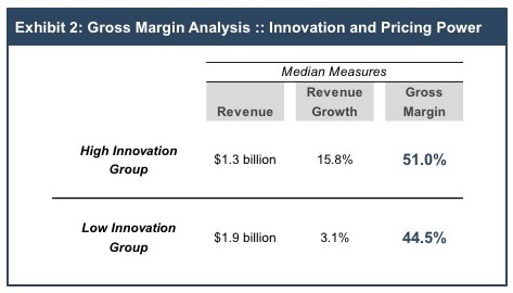 Digging a bit deeper into the data confirms the importance of innovation to customers. Since revenue growth is a decent proxy for innovation, we sorted the companies in the IT sector by compound annual revenue growth (2013 through 2017). Exhibit 2 summarizes the size, growth, and gross margin attributes for the high and low innovation groups. The median gross margin for the fast-growing high innovation group (51.0%) exceeded that of the slow-growth low innovation group (44.5%).