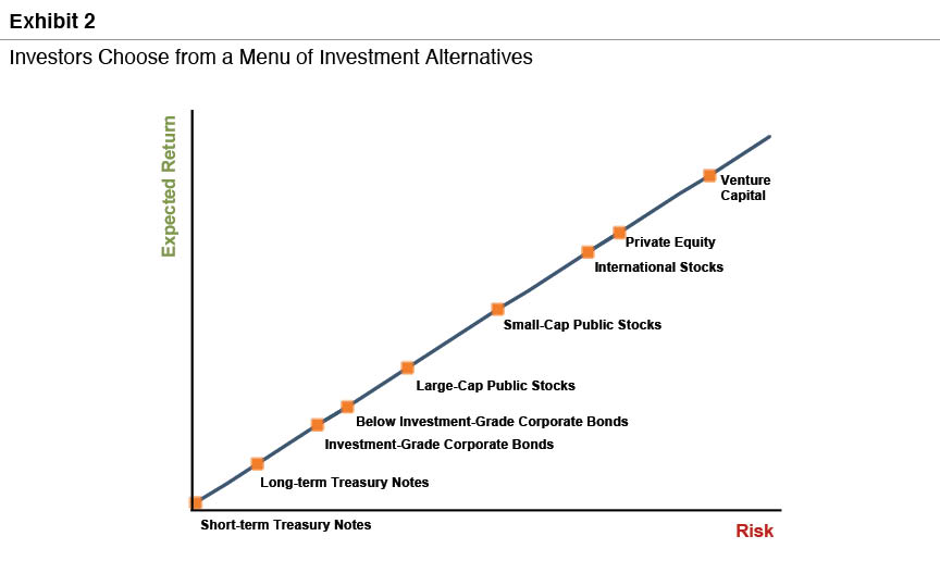 Families must select their investments from a large, but limited, menu of potential alternatives. Investors uniformly desire higher returns. However, in the process of competing with one another, investors bid up the price on less risky investments. For a given financial outcome in the future, a higher price today results in a lower return over the holding period. As a result, the more desirable investments offer lower expected returns. The second fundamental axiom of corporate finance, the risk-return relationship, follows from this. As shown in Exhibit 2, return follows risk.