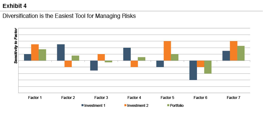 The two investments in Exhibit 4 (the blue and orange bars) have equal risk on an absolute basis. However, the returns are not perfectly correlated with one another, making them well-suited diversification partners. As a result, an equal-weighted portfolio of these two assets exhibits is less risky than either investment by itself. Since diversification is relatively easy, most people do it. As a result, the relevant measure of risk that corresponds to return (Exhibit 2) is the asset’s contribution to the overall riskiness of a well-diversified portfolio. This is called systematic risk. So, we can supplement our risk axiom as follows: return follows systematic risk.