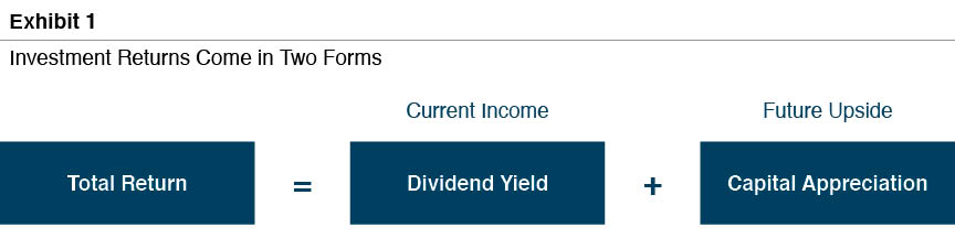 Investment returns have two components. Yield measures the current income (interest or distributions) generated by an investment. Capital appreciation measures the increase in value during the period. As shown in Exhibit 1, total return is the sum of yield and capital appreciation. There are no other sources of financial return to investors. There is an inherent tradeoff between these two components – higher current income limits future upside, and faster growth usually comes at the expense of current income.