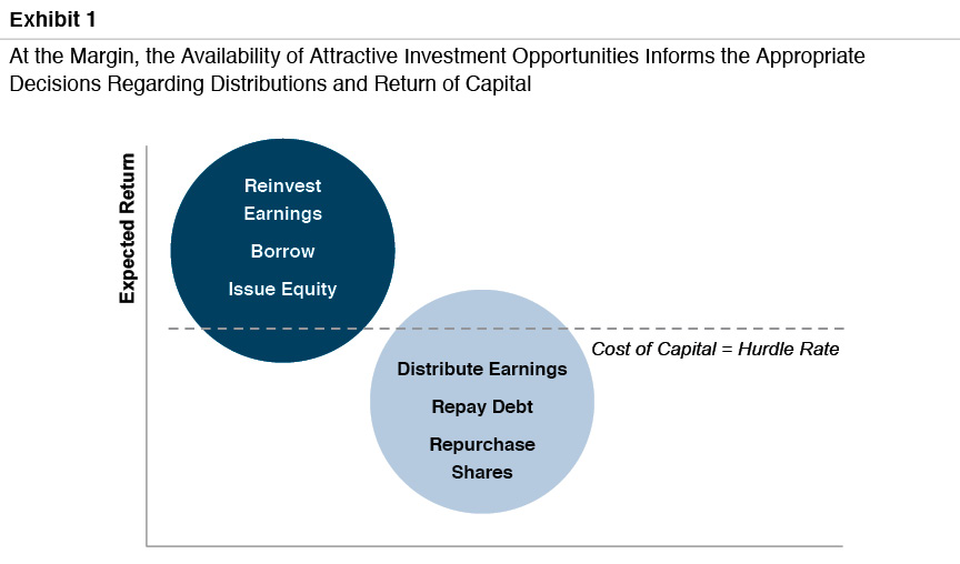 If capital projects having expected returns in excess of the cost of capital are abundant, it may be appropriate to retain a greater proportion of earnings for reinvestment than if attractive capital projects are scarce.