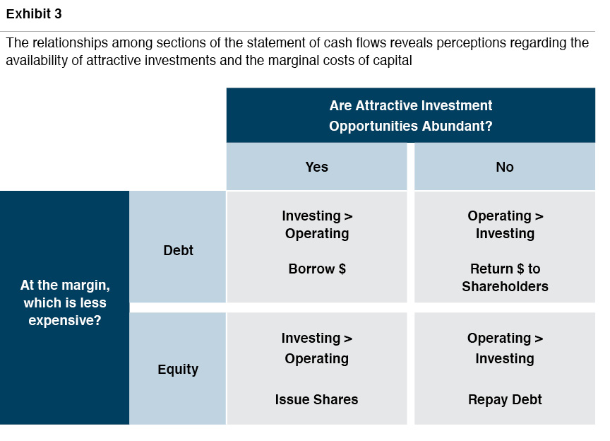 If investing cash flows exceed operating cash flows, financing cash flows must be positive (i.e., net cash inflows from either borrowing money or issuing new shares). If, instead, operating cash flows exceed (the absolute value of) investing cash flows, management and the directors believe that attractive investment opportunities are relatively scarce. Limiting the capital resources allocated to the company’s investment portfolio mitigates the pressure for growth in future earnings and cash flows but exposes the company to the potential opportunity cost of foregone investments that would have provided an attractive return. When operating cash flows exceed investing cash flows, financing cash flows will be negative, as the company will have “excess” funds to return to capital providers.