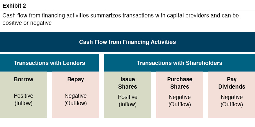 The final category is cash flow from financing activities. As illustrated on Exhibit 2 below, cash flow from financing activities summarizes the company’s transactions with capital providers during the period.