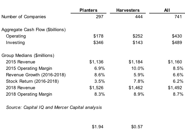 As groups, the Builders allocated 89% of total capital investment to capital expenditures, while acquisitions accounted for 81% of total capital investment for the Buyers. With regard to median size (measured by revenue) and operating margin, the two groups are virtually indistinguishable. The Buyers’ relative capital investment was greater, contributing to modestly faster revenue growth over the three years ending in 2018. Buyers are over-represented in the healthcare and IT sectors, while consumer sector (both discretionary and staples) is more hospitable to Builders.
